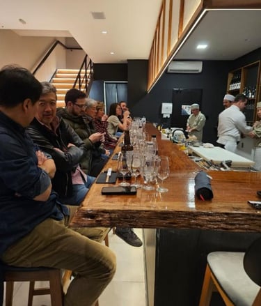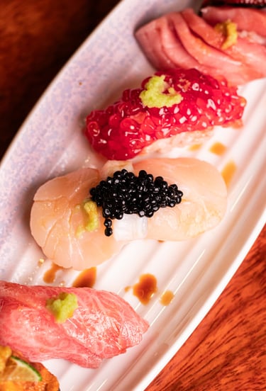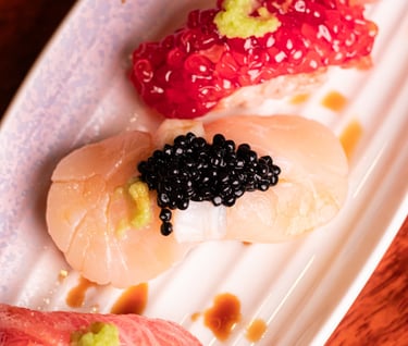 Omakase: O coração do Noda, onde o chef Julio Shimizu cria um menu degustação de 15 etapas, exclusivo com os melhores ingredientes do dia. Uma verdadeira experiência sensorial.