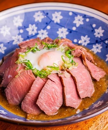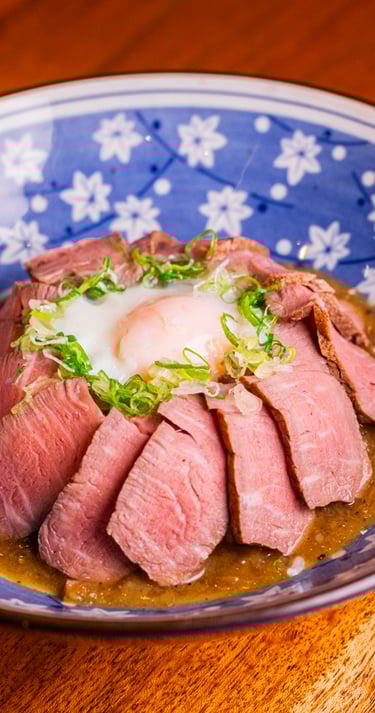 ROAST BEEF DOMBURI (R$76) Fatias de lombo de boi japonês servidas sobre uma cama de arroz.