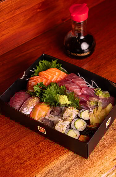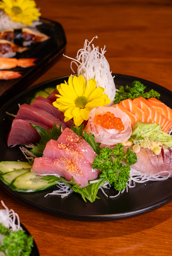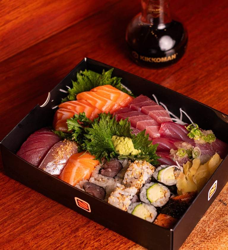 SASHIMI NAMI (R$190): Porção com 25 fatias de peixes variados.